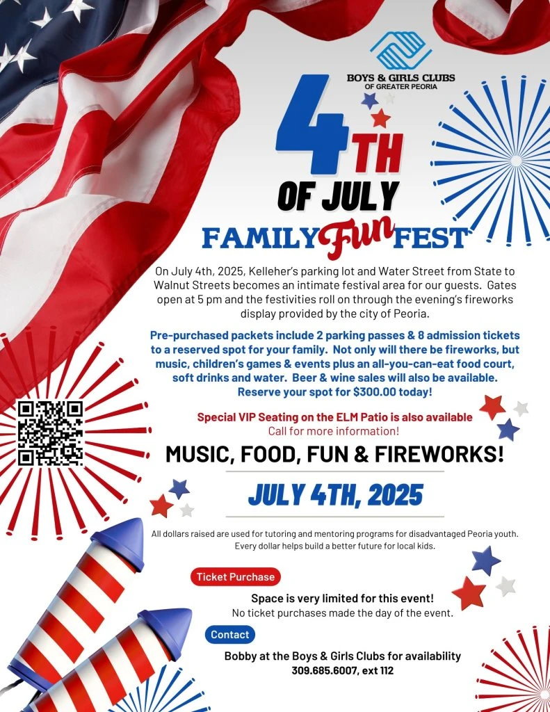 On July 4th, 2025 Kelleher's Parking lot and Water Street from State to Walnut Streets becomes an intimate Festival area for our guests. Gates open at 5pm and the festivities roll on through the evening's firework display provided by the city of Peoria.