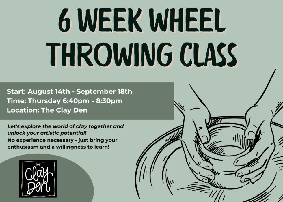 Ready to dive into the art of pottery? Our 6-week wheel-throwing course is perfect for beginners and those looking to refine their skills! In this hands-on class, you’ll learn the fundamentals of wheel throwing, including centering, pulling up walls, shaping forms, and finishing techniques.Throughout the course, you’ll create a variety of functional pottery pieces, such as mugs, bowls, and plates. You’ll also explore trimming, surface decoration, and glazing to bring your pieces to life.Course Details:🌀 Duration: 6 weeks🎨 Includes: One 25lb bag of clay, glazes, and bisque firings💰 Cost: $275🛠️ Additional clay available for purchaseThis class is designed for all skill levels—whether you’re a total beginner or looking to refine your technique. Get ready to get your hands dirty and create something amazing!Dates: Thursdays, August 14th – September 18thTime: 6:30 PM–8:30 PM