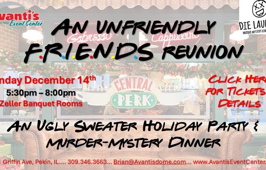 Some may have moved away, but they didn't necessarily move on... the answer to "How you doin?" will not be good for one guest!It's the holiday season and the beloved "F.R.I.E.N.D.S" have reunited for an Ugly Sweater Holiday Party! It doesn't take long to realize that after years apart, it's not alway easy to pick up where one leaves off. Same may have moved away, but they didn't necessarily move on. The answer to "How you doin?" will not be good for at least one guest.This audience-interactive murder mystery will create an evening of conspiracy, mystery, and drama.Wear your best Ugly Sweater, Christmas Suit, Pink Bunny PJs, or anything else you care to wear!Food will be catered and served buffet style! Cash bar available.The Murder Mystery Location is in our Zeller Banquet Event Center.Here are the details:When: Sunday December 14th, 2025Time: Doors Open at 5:30 for cocktail hour. Dinner at 6:30 PMPrice: Tickets are $40 per person or $280 for a full table of 8.Menu: Monica's Lasagna!, Green Beans, Salad, Avanti's Bread, & Dessert.Important Information:This show takes place inside the "Zeller Banquet Center".A drink station will be set up with lemonade, iced tea, and coffee.Alcoholic beverages and sodas can be purchased at the bar.Absolutely NO OUTSIDE FOOD OR DRINKS.Seating is first come/first served.Our tables will sit 8 guests each.Please note: You will be seated with other guests at the same table unless you purchase a full Table of 8.Any questions feel free to call us at 309.346.3663 or email at Brian@AvantisDome.comNO REFUNDS