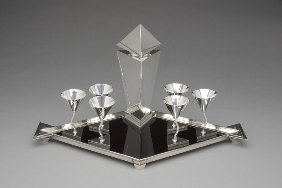 In the early 20th century, skyscrapers transformed New York City and became symbols of American innovation and modernity. Beyond physically altering the urban landscape, these iconic structures changed perceptions of space, isolation, and control. With images from a 2024 Milwaukee Art Museum exhibition, Chyna Bounds will illuminate the complex impact of skyscrapers on the human experience through prints, photographs, and design objects by artists including Walker Evans, Paul T. Frankl, and Louis Lozowick. Bounds is Assistant Curator, American Decorative Arts and Design, at MAM. Pictured: Elsa Tennhardt (American, b. Germany, 1889–1980), Cocktail Set, ca. 1928. Silver-plated brass and “Vitrolite” glass. Manufactured by E. & J. Bass Company, New York, NY. Milwaukee Art Museum.