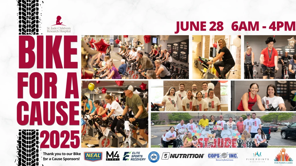 June 28, 2025 Five Points Washington will be hosting our annual charity bike ride, Bike for a Cause, to raise money for the kids at St. Jude Children’s Research Hospital.