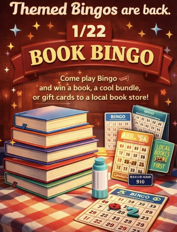 Come play bingo, grab some drinks, and have a chance to win:• A brand new book• A fun book bundle• Gift cards to a local book store