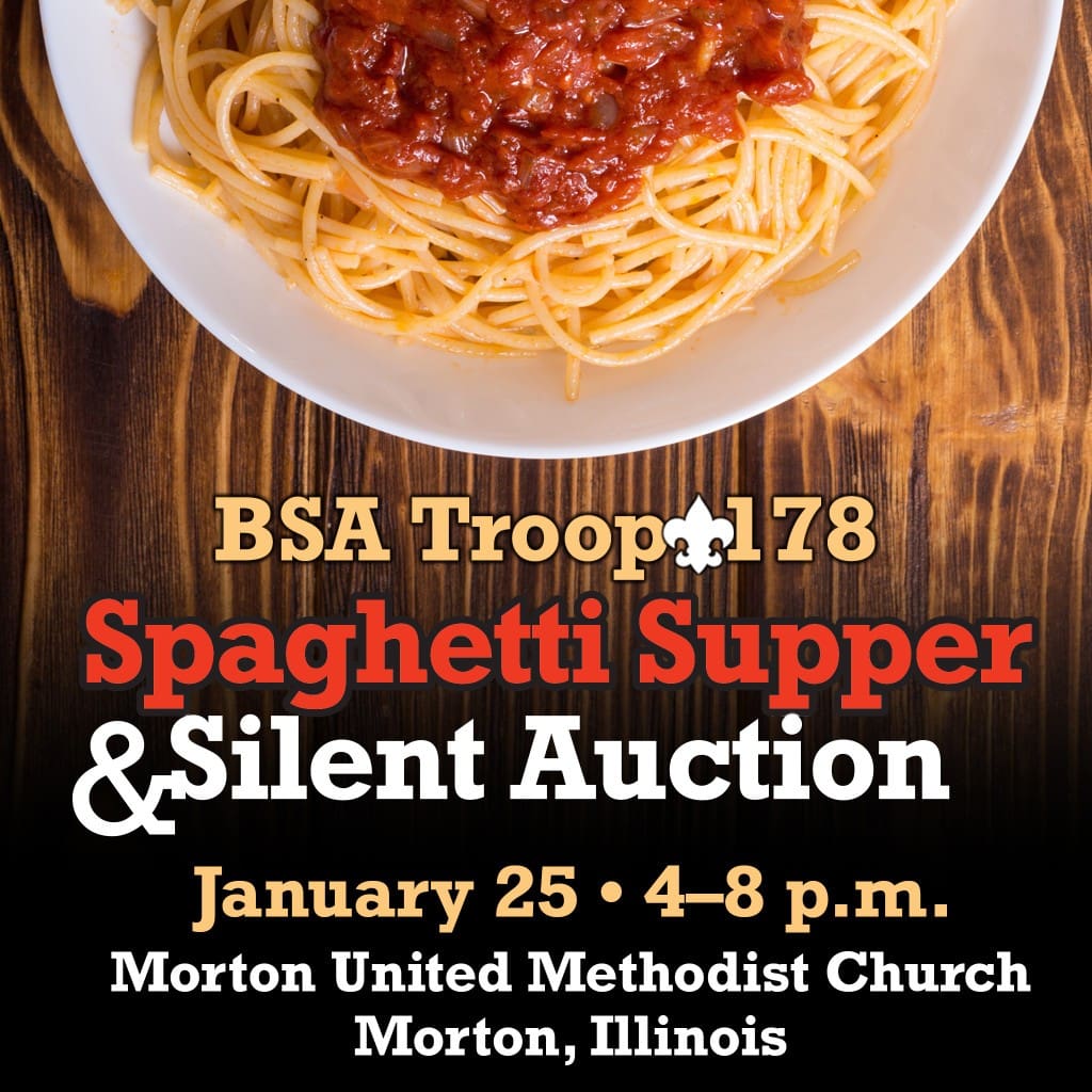 Ticket includes spaghetti with sauce (meat or no meat available), garlic bread, salad and beverages, all cheerfully served by the members of Scouts BSA Troop 178. Carryout will be available.