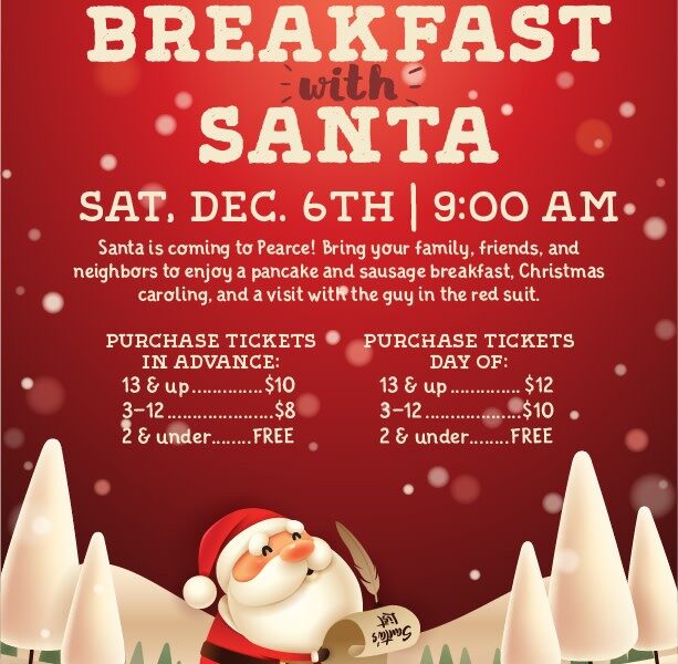 Santa is coming to Pearce! Bring your family, friends, and neighbors to enjoy a pancake and sausage breakfast, Christmas caroling, and a visit with the guy in the red suit.