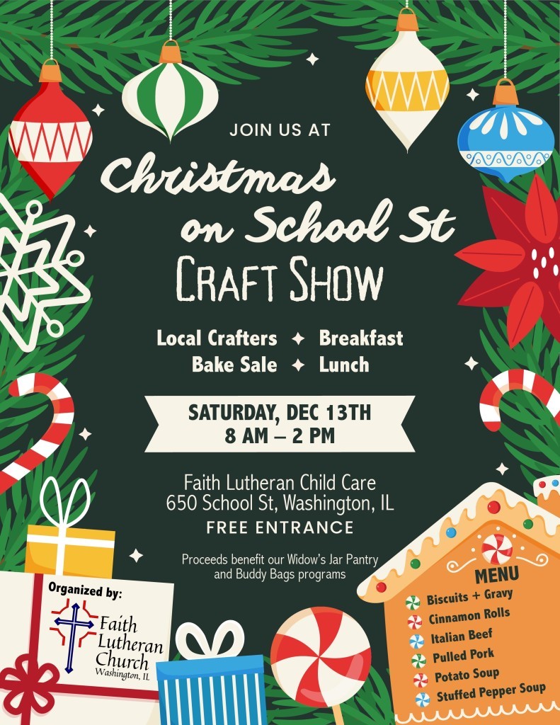 Local Crafters-Breakfast-Lunch-Bake SaleSave the date for Saturday, December 13 for the return of Christmas on School Street Craft Show. Shop for Christmas gifts or buy something for yourself from our talented local crafters. Start your day with biscuits and gravy or a cinnamon roll. Enjoy either potato soup or stuffed pepper soup. Try an Italian beef or pulled pork sandwich with chips. We will have lots of baked goods to purchase. Free entry!Proceeds will benefit our Widow’s Jar Pantry and Buddy Bag program.