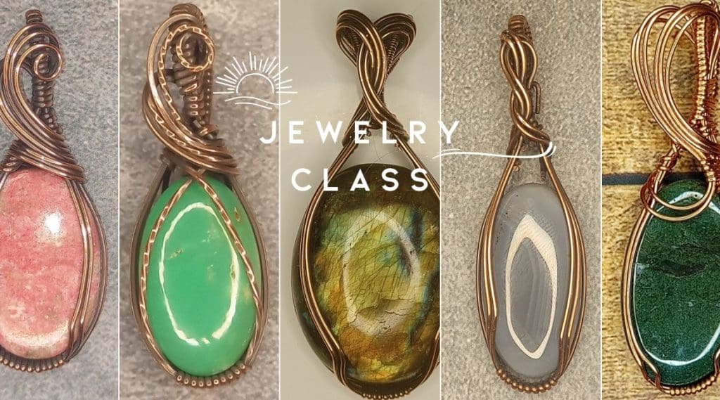 The $50 per person class fee includes all supplies, instruction and wine sampling of three wines for 21+ attendees. In-person class includes: Instruction and materials to make 1 copper and stone pendant necklace. Payment is due when registering and all attendees must register make payment in advance for this class experience and will make one pendant.