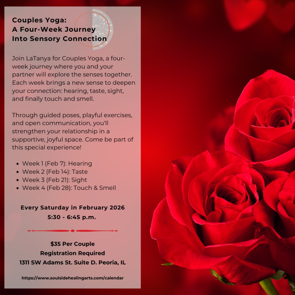Couples Yoga with Latonya is a four-week journey exploring the senses together. This series is designed to deepen connection, intimacy, and communication through guided poses and fun. Each week, we’ll focus on a different sense:Week 1 (Feb 7): HearingWeek 2 (Feb 14): TasteWeek 3 (Feb 21): SightWeek 4 (Feb 28): Touch & SmellJoin us to strengthen your bond in a supportive and joyful space!Fee: $35 per couple for each sessionRegistration is required at Soulsidehealingarts.com/calendar