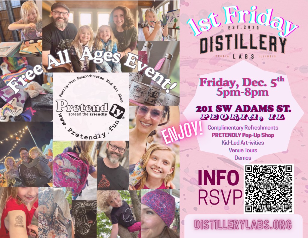 Join us for Distillery Labs’ 1st ever ‘First Friday’ featuring Pretendly. Expect an energizing artistic experience. Pretendly’s takeover of Distillery Labs highlights the innovation hub’s dedication to even its smallest of small business owners!Peoria, IL — 2025 is coming to an end, but it’s just the beginning for fun, new vibes at Distillery Labs! Kick-off the innovation hub’s first ever ‘First Friday’ featuring its first Artist-in-Residence…Pretendly! (www.Pretendly.fun)Get ready for a night of playful original art by local kid artists Larkin and Willa. Their small business Pretendly has aimed to ‘Spread the Friendly with Pretendly’ since its creation in 2021 when the Sisters were just 5 and 7 years old.Whether you’re a kiddo and grown-up, this will be an inspiring, uplifting gathering. Want to discover something with celebrating? This one’s for you!Event Details:Date: Friday, December 5, 2025Time: 5:00 PM – 8:00 PMLocation: Distillery Labs (201 SW Adams St.; Peoria, IL 61602)Cost: Free (Registration at DistilleryLabs.org recommended)Who: Open to the Public. All ages and abilities are encouraged to attend!---Exciting Pop-Up: Pretendly products will be available for sale and in time for holiday gift-giving!Community Connection: Connect with others passionate about entrepreneurship, innovation, and creativity.Vibe: Come as you are! Enjoy the upbeat playlist curated by our 9 and 11 year old artist hosts. Bring your littles to make free kid-led art projects perfect for themselves or to share as gifts for upcoming holidays!Tours of Distillery Labs: Explore the impressive co-working space where this event will take place. Discover how Distillery Labs is supporting local businesses and creative ventures in Peoria.Refreshments: Enjoy complimentary refreshments while you connect and engage.---For more information, please visit DistilleryLabs.org. For media inquiries or more information about the event, please contact: Jennifer Rosa at jennifer@distillerylabs.org. Get involved. Get inspired. Get connected. Join us for an unforgettable evening of creativity, connection, and community!---About Pretendly: Pretendly (www.Pretendly.fun) is a Family-Run Neurodiverse Kid Art Shop offering unique clothing, accessories, and gifts designed from their young daughters’ original artwork. Pretendly is the re-routing of their own life challenges through a fun and creative outlet where their kids can thrive. The oldest Pretendly Daughter is neurodivergent (Autism) and youngest is neurotypically developing, and together they offer their uplifting integrated styles made to wear and share! The family began the business in an effort to help their kiddos bounce back from a particularly painful exclusion they experienced. Despite the loss they felt, they chose to find the gains and insist on inclusivity head on. Pretendly believes a wondrously inclusive world of knowing and growing doesn’t have to be pretend…it’s just more fun when it’s Pretendly! Visit the website and socials, shop, share, connect today…and see how you can help “Spread the Friendly with Pretendly”!• www.Pretendly.fun• Facebook.com/hellopretendly• Instagram.com/pretendly.fun• TikTok.com/@pretendlyAbout Distillery Labs: Distillery Labs is a vibrant co-working space in Peoria, designed to foster collaboration, creativity, and innovation. With a commitment to supporting local startups and entrepreneurs, Distillery Labs is an ideal setting for community-focused events like this one.Host | Venue: Distillery LabsPresenting: Pretendly Neurodiverse Art ShopArtists: Pretendly Sisters - Larkin (Neurodivergent Artist, Age 11) and Willa (Neurotypical Artist, Age 9)Producer: Jennifer RosaSponsors: Distillery Labs | Pretendly | Flat World Productions |