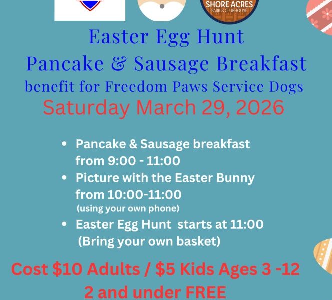 Pancake & Sausage Breakfast: 8:00–11:00 AMPictures with the Easter Bunny: 10:00–11:00 AMEaster Egg Hunt: Starts at 11:00 AM
