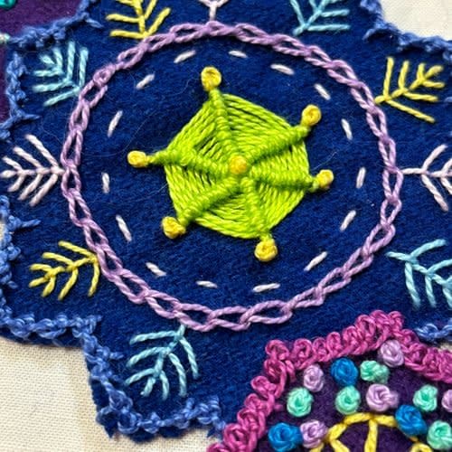 Class 2: Flora and Fauna: Circles, leaves, French knots and bullion stitch.