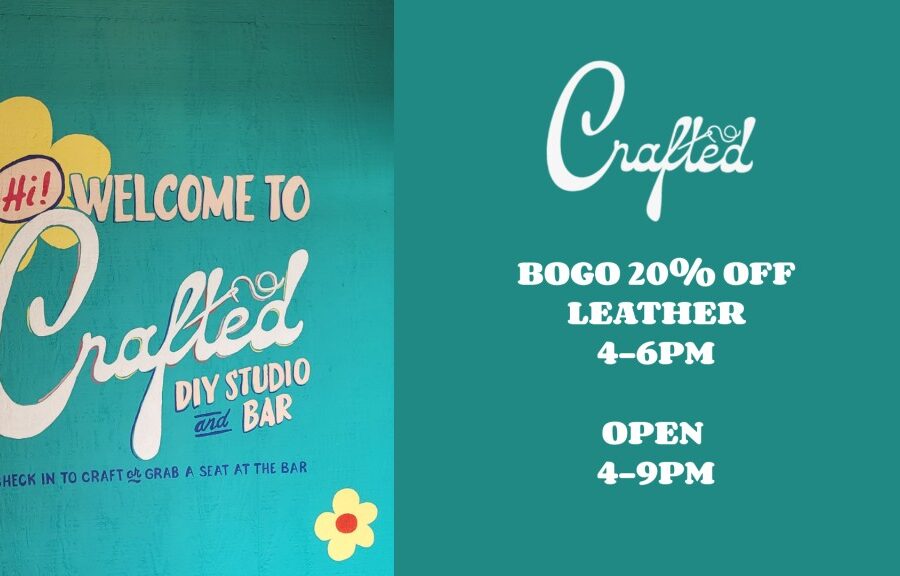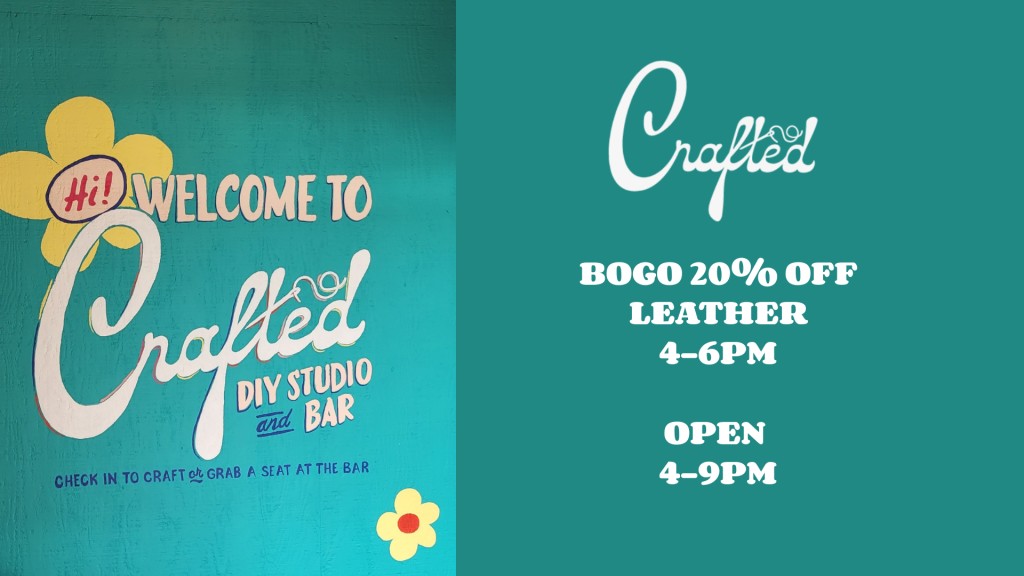 Kick off your weekend with a fun and creative night at Crafted! Join us every Friday night for a special BOGO 20% OFF all leather projects. Create your own wallet, passport holder, flask wrap, or koozie—and you can mix and match to take advantage of the deal.