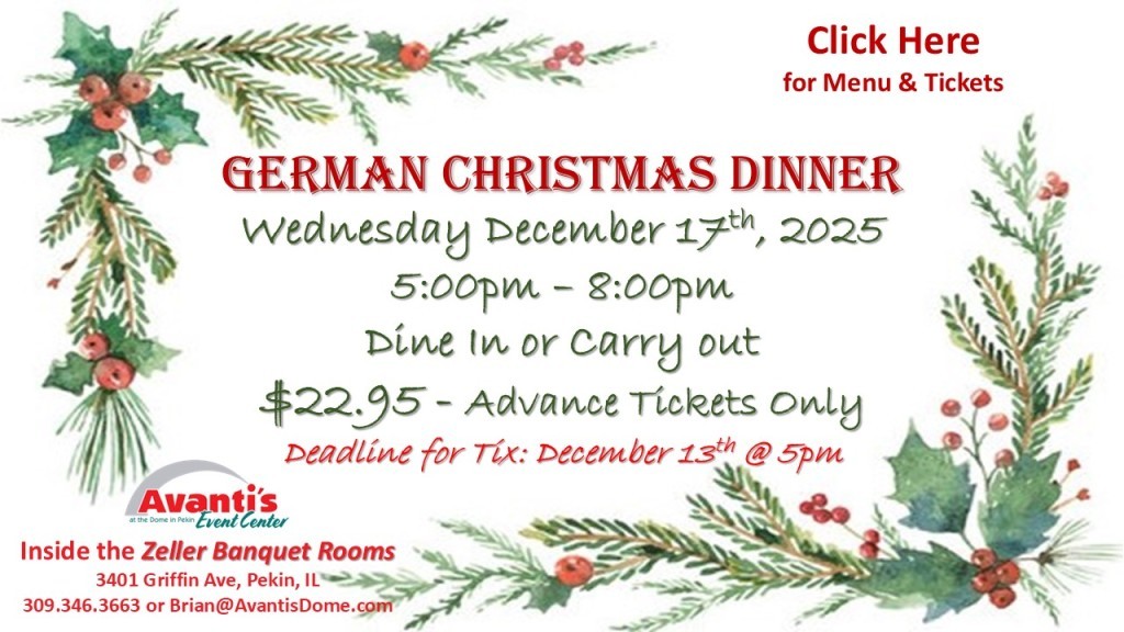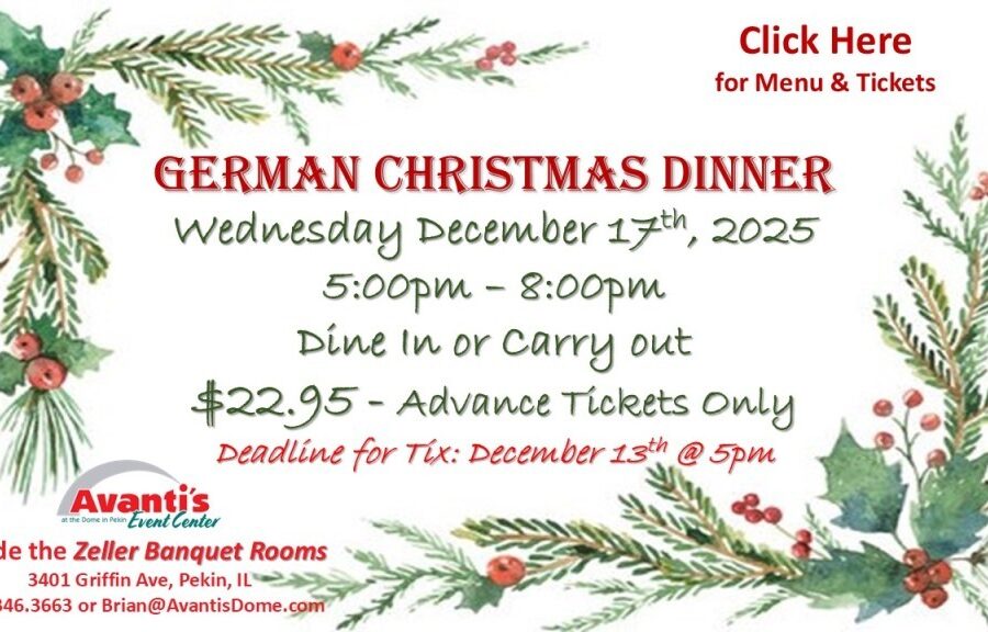 Take a break from making dinner (or shopping) and enjoy a Traditional German Christmas Dinner... dine in or to go!Date: Wednesday December 17th, 2025Time: 5:00pm - 8:00pmPrice: Only $22.95 (before taxes/fees)Tickets only available in advance. No tickets available at the doorDeadline for Tickets: December 13th @ 5pmMenu: Sauerbraten (German roasted meat), Choucroute Garnei (bratwurst & sauerkraut), Rotkohl (red cabbage), & Schwabischer Kartoffelsalat (german potato salad).There will be a drink station for dine in customers with coffee, iced tea, lemonade, and water. The bar will also be open for dine in customers with soda & adult beverages including German Beer.No outside food or drink.No refunds.