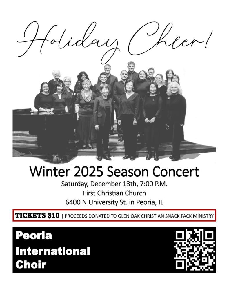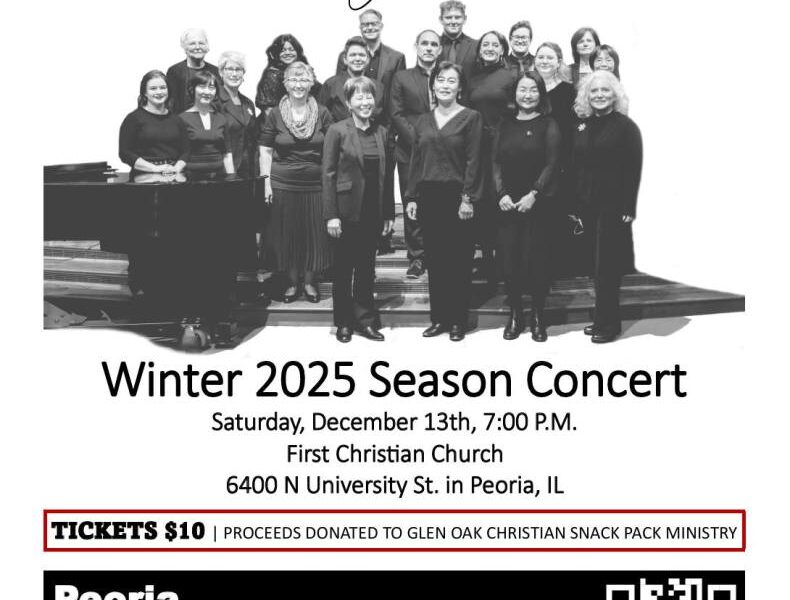 Our Winter 2025 Season Concert will feature a stunning ensemble of work from Francis Poulenc, Morten Lauridsen, traditional holiday carols from around the world, and much more. Everyone will find something to enjoy!Tickets are $10 at the door via cash or card, or $12.51 with Eventbrite fees when purchased on Eventbrite.This Season, our ticket proceeds will be donated to Glen Oak Christian Snack Pack Ministry, which has worked since 2012 to provide snack packs for families in the area of Peoria, IL.Please join us in-person or online* for this celebration of music, community, and hope.*All Eventbrite ticketholders will receive a link to stream the concert on YouTube on December 13th.