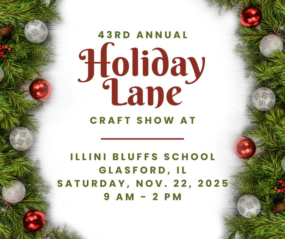 The 43rd annual Holiday Lane craft show will be held at Illini Bluffs High School in Glasford, on Saturday, November 22, from 9 am - 2 pm. Enjoy holiday shopping with over 80 crafters sharing their talents and creativity. Everything at the show is handmade. In between shopping, listen to K – 12 students perform, from choirs and Madrigal to Concert Band and Jazz Band. Proceeds benefit the Illini Bluffs K – 12 music programs. Holiday Lane is sponsored by the Illini Bluffs Music Boosters.