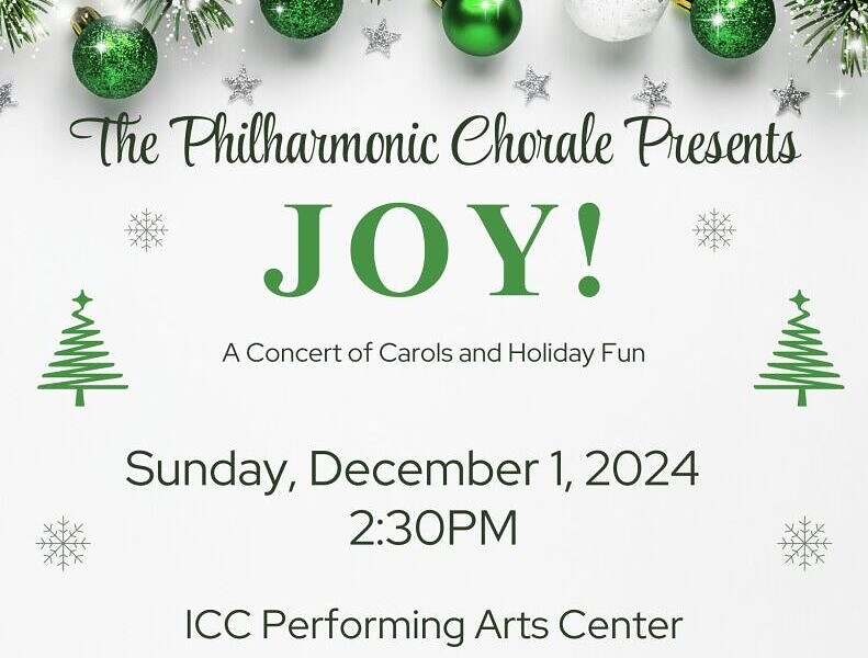 The ICC Philharmonic Chorale – a choral group in-residence at ICC - will perform its winter concert, "JOY! A Concert of Carols and Holiday Fun", consisting of seasonal songs and carols on December 1st at 2:30 pm in the ICC Performing Arts Center on ICC's East Peoria campus. A variety of choral numbers, some accompanied by 4-hand piano and stringed instruments, will be performed. Tickets ($10) are unreserved and can be purchased at the door, from a chorale member, or online using the QR code on the attached poster or at www.icc.edu/arts/ - find 'Philharmonic Chorale'; click on 'Buy Tickets'.