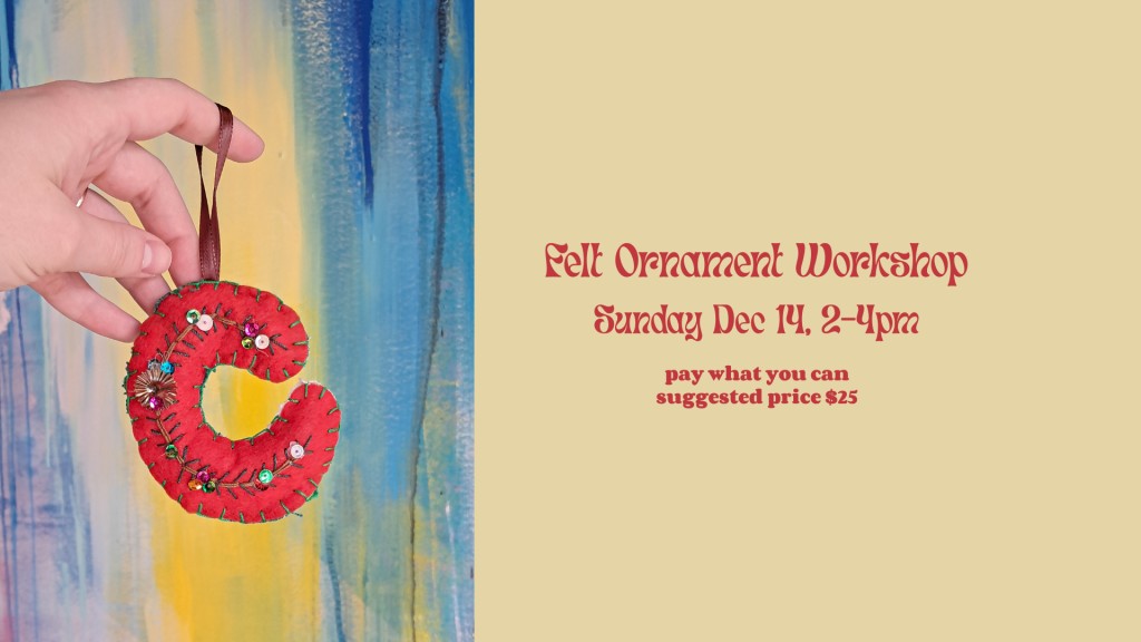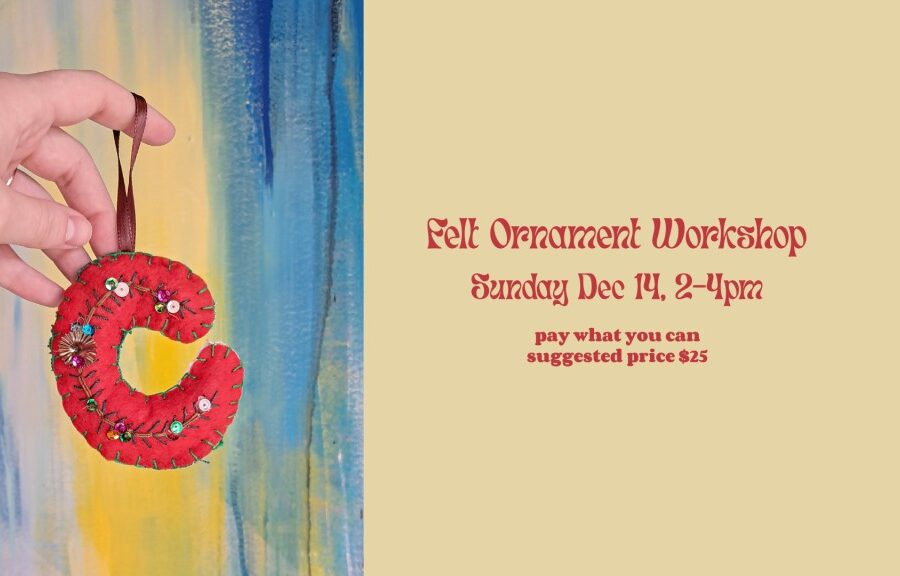 Create a felt ornament in this festive workshop led by our embroidery expert - Lauren! In this class you’ll learn some basic embroidery techniques and go home with a cute felt ornament to gift or keep. The price includes all materials and instruction. Our craft cocktail bar is open during the event to order cocktails, mocktails, cocoa and more! This ornament workshop is a series of 5 so collect them all, a few, or just your favorite. Create any letter!This is an in-person event, make sure you present your confirmation email at the door. Our studio is located at 807 SW Adams St, Peoria IL.This workshop is being offered on a pay what you can basis, with a suggested price of $25. The $2 minimum covers our online sale fees.