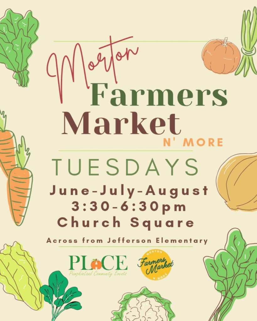 Visit WebsiteMorton Farmers Market N More is held on Tuesdays from June through August each Market Season, starting at 3:30 pm and ending at 6:30 pm in Church Square in Downtown Morton.