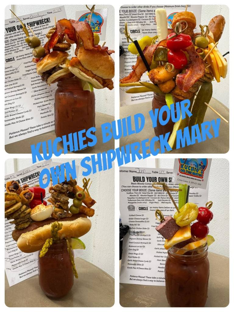 It's the day before a new year, might as well have a little fun. Doing these all day, you just choose your drink( doesn't have to be a mary) then choose your toppings and wait for the shipwreck buildier to pile up the magic!! Each item is priced individually. Lots of choices, something for everyone.