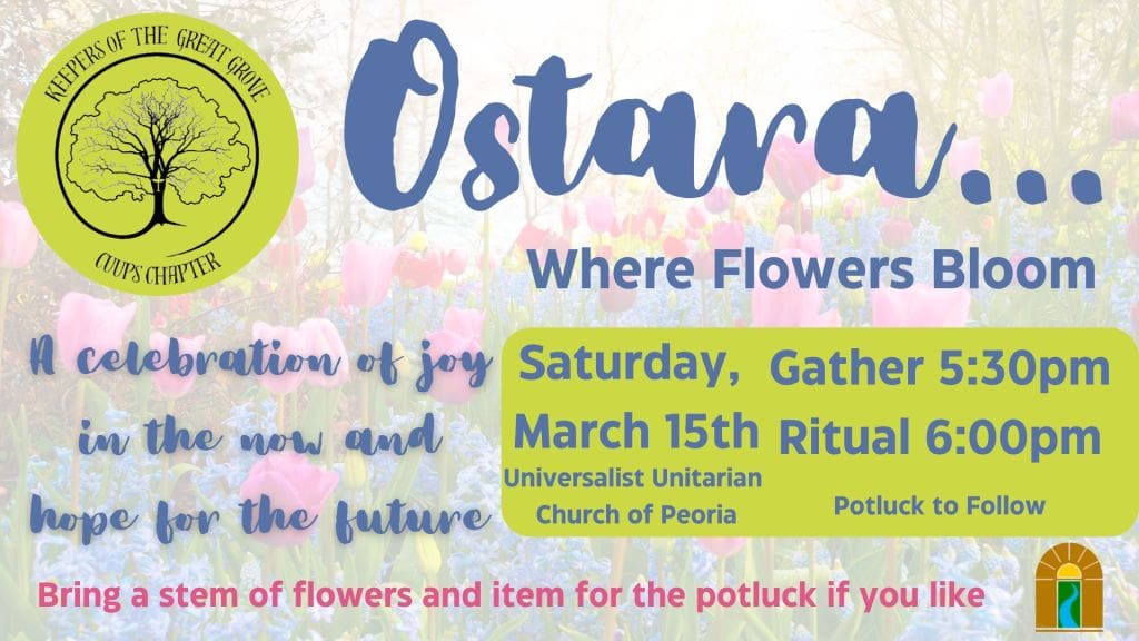 Ostara: where flowers bloom. Springtime is upon us! The holiday of Ostara is a time of awakenings and new beginnings. Bring a stem of flowers if you would like, salad bar ingredients and toppings are welcome additions to the potluck. All are welcome.