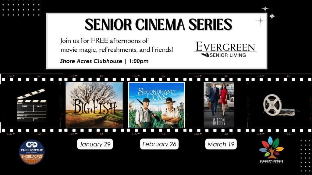 Join the Chillicothe Parks Foundation & Chillicothe Park District at Shore Acres Clubhouse for FREE afternoons of movie magic, refreshments and friends! Sponsored by Evergreen Senior Living.