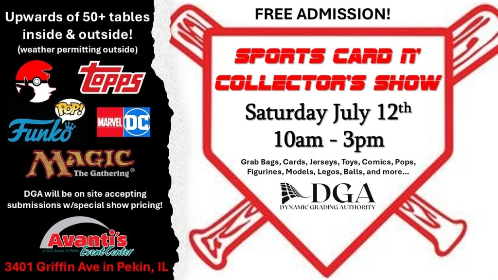 Sports Cards, Pokemon, Pops, Magic the Gathering, Game Used Material, Autographed Memorabilia, Comics, Loaded Grab Bags, Legos, Star Wars, and much much more!DGA Grading will be there to accept submissions for discounted grading of your cards.Concessions will be open with food and even adult beverages.