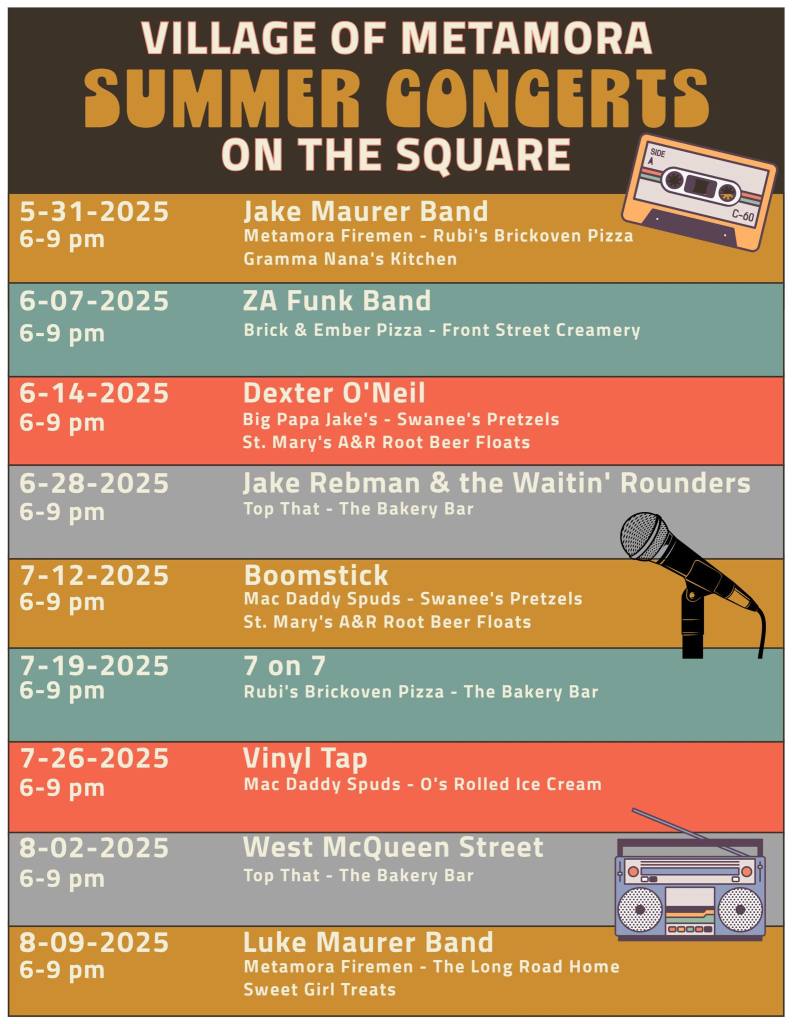 The free concerts sponsored by the Village of Metamora are held on Saturday evenings at the bandstand in the Park on the Square. The public is invited to attend and bring their own lawn chairs, although bleacher-type seating is available. There will not be concerts on June 20th or July 4th.