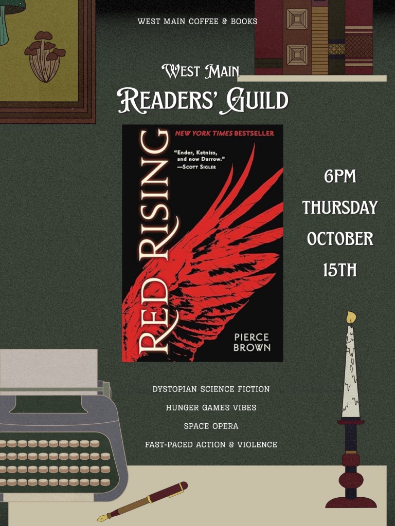Let's discuss Red Rising by Pierce Brown! First timer? All you need to do is read the book, come inside and get a drink if you'd like, and find a comfy spot with the group. Doors open at 5:30pm and we encourage anyone who wants to purchase a drink come in early. The bookstore register will stay open all night for any shopping before or after book club. Hope to see you there!RSVP to westmaincoffeeco@gmail.com is highly encouraged, but last-minute attendees are welcome.