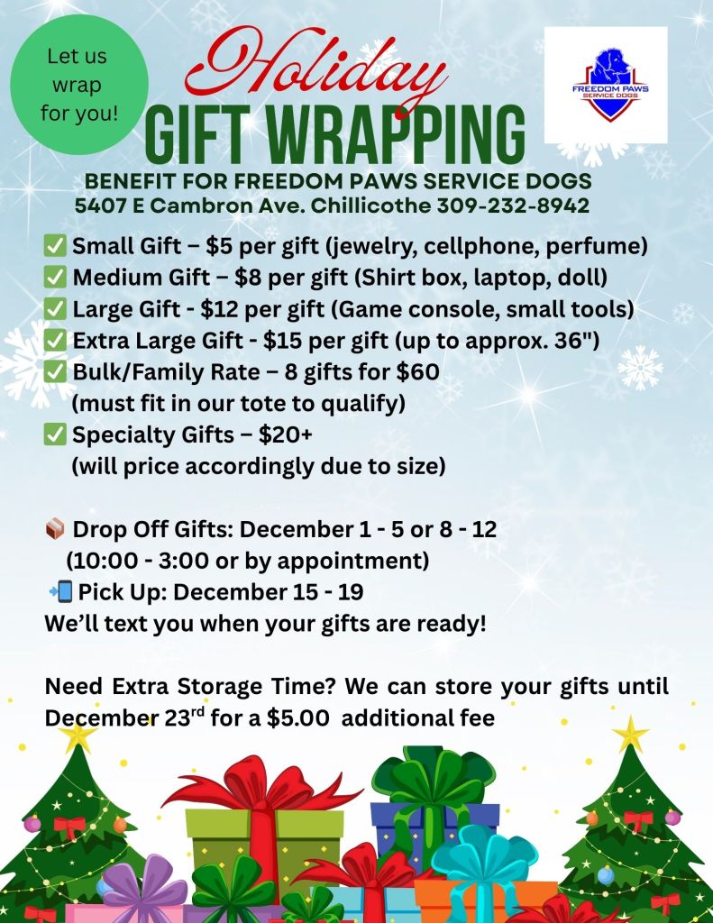 Do you hate wrapping presents or just don’t have the time? Let Freedom Paws Service Dogs do it for you! We’ll handle the wrapping so you can relax and enjoy the holidays.Stay tuned for dates, times, and locations — all proceeds help support our Veterans and First Responders!