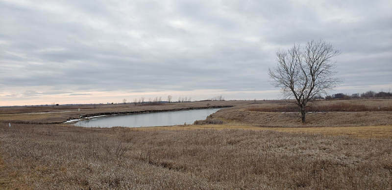 A lake surrounded by wetlands creates an area for migratory birds and a place for hunting waterfowl. The area is also characterized by native grasslands and field acreage.