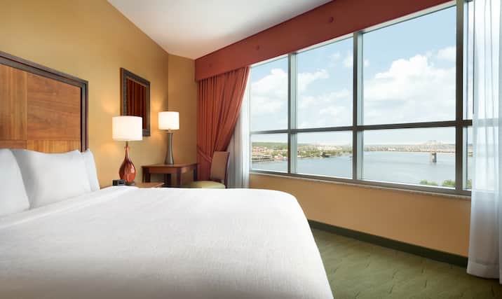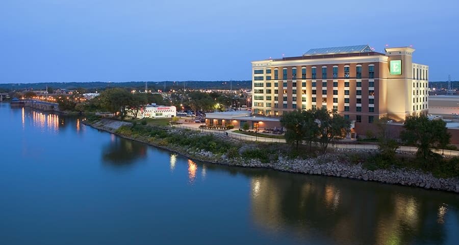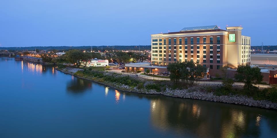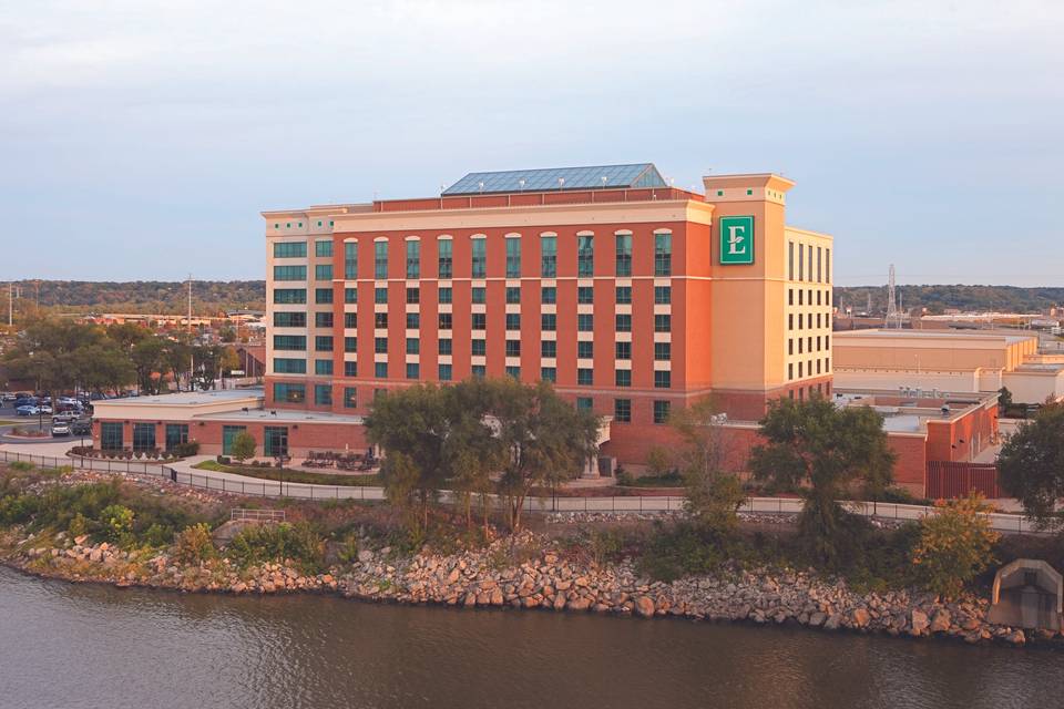 Located on the Illinois riverfront, Embassy Suites by Hilton East Peoria Riverfront Hotel & Conference Center is within easy reach of the Caterpillar World Headquarters, Bradley University, Par-A-Dice Casino, Eastside Centre, Peoria Civic Center, and within walking distance of many restaurants and shopping venues. This Peoria, Illinois riverfront hotel is the ideal option for East Peoria meetings and events, and boasts a 24-hour Embassy BusinessLink™ Business Center and a 35,000 sq. ft. conference center. This Embassy Suites hotel in East Peoria, Illinois features 226 two-room suites, each with a separate sleeping and living area and a host of convenient amenities including a microwave, refrigerator, coffeemaker and two 40-inch televisions with cable. Relax and unwind after a long day of business or sightseeing with all the comforts of home. Start the day with a delicious made-to-order breakfast buffet, and end the day with complimentary drinks and refreshments at our Evening Reception*. Relax in our newly renovated lobby, featuring large communal tables, which is a great gathering spot for work or entertainment before or after lunch or dinner at the Riverside Café. Featuring an outdoor riverfront patio and private dining for intimate gatherings, Riverside Café is an excellent dining option. This hotel's impressive 35,000 sq. ft. of conference space in Illinois presents the flexibility to host successful business meetings and conventions, and provides stunning spaces to host the perfect East Peoria wedding. #1 on TripAdvisor #1 Embassy Suites in the world in 2008